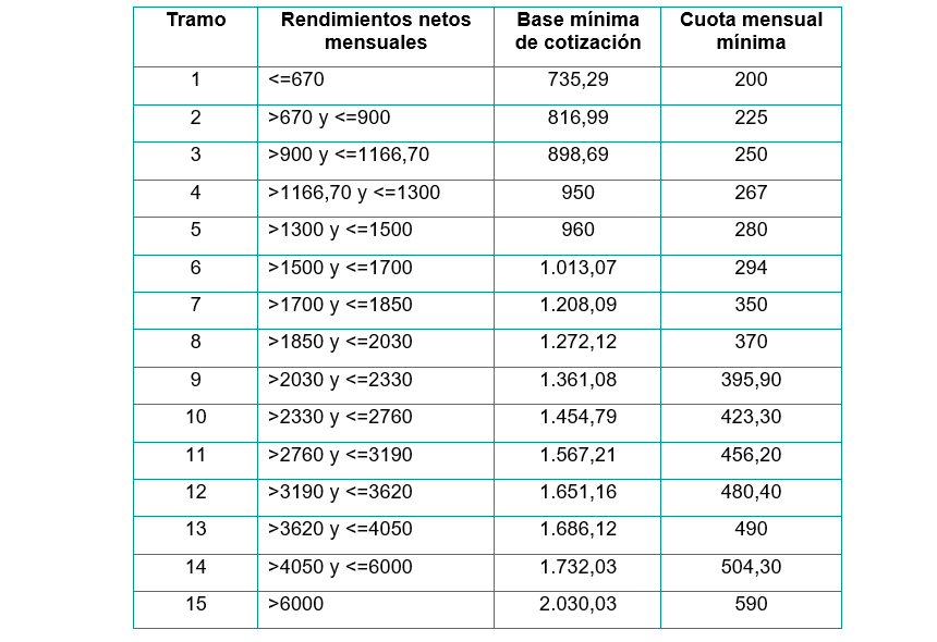 El sistema de cotización vigente para 2026 se estructura en 15 tramos que relacionan los rendimientos netos mensuales del autónomo con una base mínima de cotización y, por tanto, con una cuota mensual específica. A continuación, se presenta la tabla completa con todos los tramos: