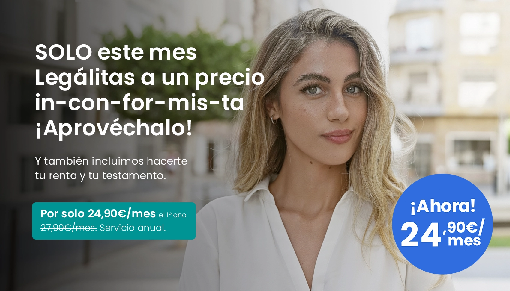 Servicio de duración anual para asesoramiento jurídico sobre asuntos de la vida familiar (no empresarial ni profesional) del cliente. Contigo: precio anual 238,80 €, cuota mensual 19,90 €. Contigo Plus: precio anual el 1º año: 298,80 €, cuota mensual el 1º año: 24,90 €. Contigo Premium: precio anual el 1º año: 478,80 €, cuota mensual el 1º año: 39,90 €. Consulte las condiciones generales en www.legalitas.com