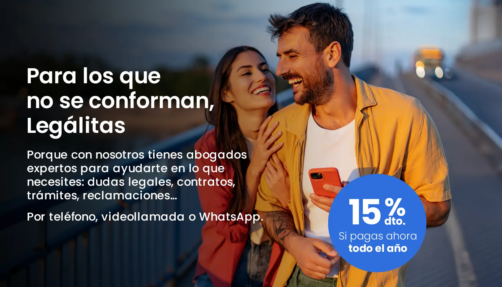 Servicio de duración anual para asesoramiento jurídico sobre asuntos de la vida familiar (no empresarial ni profesional) del cliente. Contigo: precio anual 238,80 €, cuota mensual 19,90 €. Contigo Plus: precio anual: 358,80 €, cuota mensual: 29,90 €. Contigo Premium: precio anual: 546 €, cuota mensual: 45,50 €. Consulte las condiciones generales en www.legalitas.com